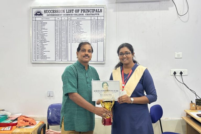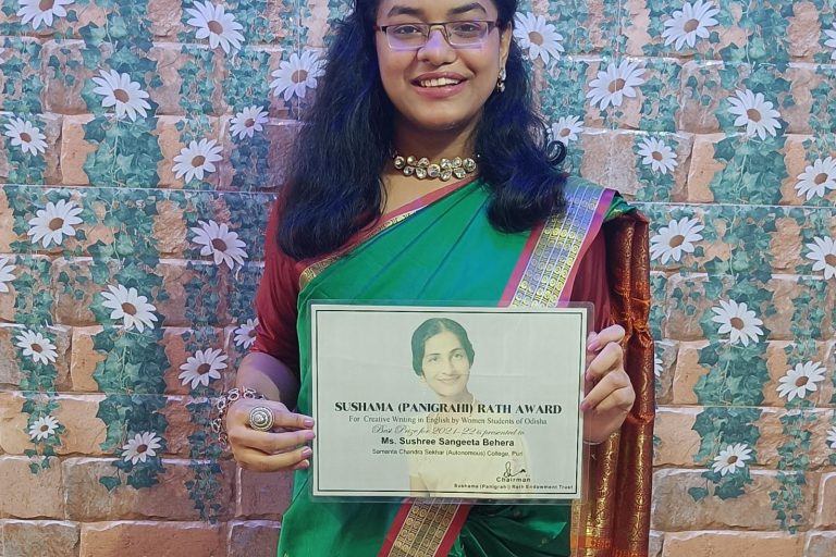 Best Award:- Ms. N. Harapriya Reddy Article Title: “The Neighbour’s Window” Government Science College, Chatrapur. Principal Dr. Ajay Kumar Tripathy, recognized Ms. Reddy with a trophy from the college, on top of the award money, that she received from the Sushama (Panigrahi) Rath Award Committee. Merit Award:- Ms. Priyanka Priyadarshini Sethi Article Title: “THE POSTPONED…